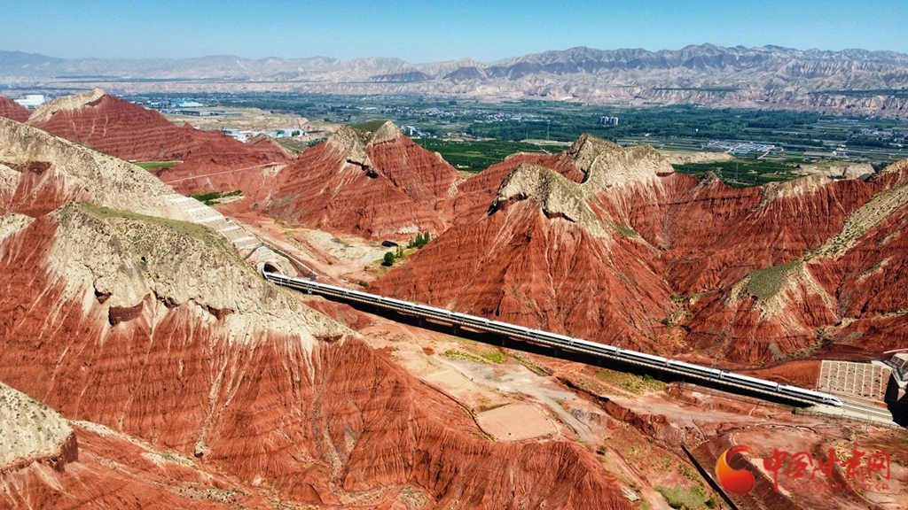 朝家山隧道位于蘭州市紅古區(qū)和青海省民和縣交界處,是蘭新高鐵西出蘭州必經(jīng)之地。在這里,通體呈紅色的丹霞地貌在湛藍(lán)天空下越發(fā)顯得艷麗奪目,列車穿越七彩丹霞,風(fēng)景如畫風(fēng)光無限好。