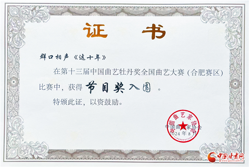 據(jù)了解,中國曲藝牡丹獎,是全國性曲藝藝術專業(yè)最高獎項。第十三屆中國曲藝牡丹獎全國曲藝大賽(合肥賽區(qū)),由中國文學藝術界聯(lián)合會、中國曲藝家協(xié)會、安徽省文化和旅游廳、安徽省文學藝術界聯(lián)合會、合肥市人民政府主辦,于8月18日至23日舉辦,是本屆牡丹獎四個分賽區(qū)中的最后一站,主要面向相聲、小品、“三書”類節(jié)目。中國曲協(xié)18家團體會員、中國曲協(xié)香港會員分會、中國曲協(xié)有關專業(yè)委員會、中直文藝院團以及省級文藝院團報送的節(jié)目參賽。期間,共收到480多個節(jié)目,48個節(jié)目入圍,《這十年》為甘肅地區(qū)唯一一件入圍作品。