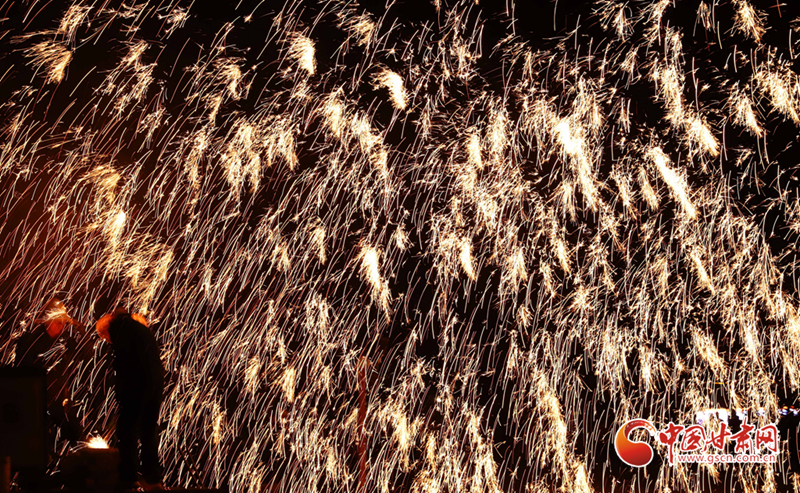 10月5日晚,位于甘肅省張掖市甘州區(qū)的玉水苑生態(tài)景區(qū)內(nèi),非遺傳承人在為游客和市民表演國(guó)家級(jí)非遺項(xiàng)目打鐵花。(王將 攝)