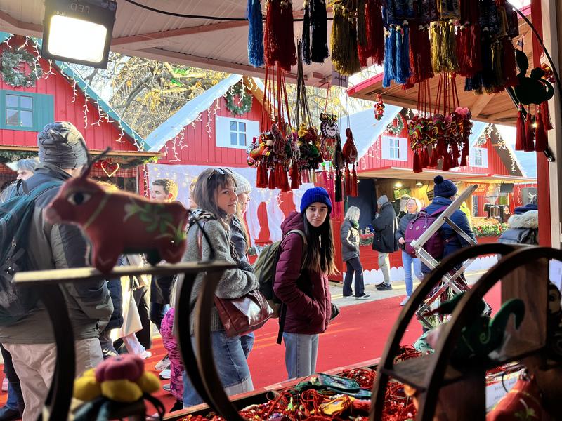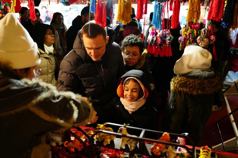 (法國巴黎圣誕集市的慶陽香包展位前,外國友人正在駐足欣賞。)