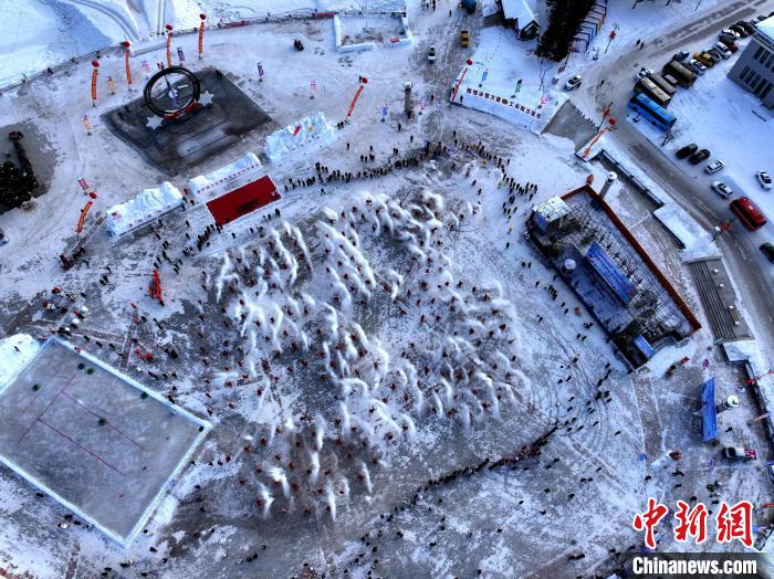 當(dāng)日,北極村七星廣場上,身披紅斗篷、頭戴紅帽子的游客和當(dāng)?shù)鼐用窠M成一個(gè)巨大的“53°”造型。伴隨著激情澎湃的音樂,他們擺好姿勢(shì),將手中熱水奮力一灑,齊聲高喊“極致興安嶺 潑出好風(fēng)景”,一道道劃破天際的弧線,碰撞出的神奇光影。震撼的場面讓現(xiàn)場游客驚呼不已,他們紛紛舉起手機(jī)定格這個(gè)精彩瞬間。