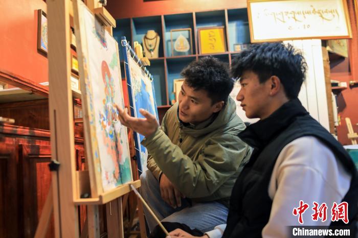 四川省甘孜藏族自治州理塘縣勒通古鎮(zhèn),是一個融合了特色傳統(tǒng)文化和現(xiàn)代創(chuàng)新的重要旅游目的地。近年來,理塘縣強化地域特色文化的保護,并引導(dǎo)當(dāng)?shù)鼐用翊蛟炝艘幌盗刑厣幕糜涡马椖?。唐卡、皮具工藝、藏文書法及土陶制作等傳統(tǒng)工藝項目不僅得到了保護,還吸引了大量游客前來觀賞和交流。圖為12月22日,在勒通古鎮(zhèn)的“唐卡館”,畫師昂旺登登(左)指導(dǎo)洛絨曲扎繪制唐卡。中新社記者 王磊 攝