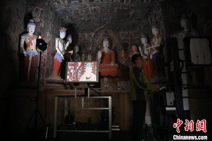 2024年6月5日,甘肅省敦煌市莫高窟內(nèi),敦煌研究院文物數(shù)字化研究所工作人員進行敦煌壁畫數(shù)字化采集工作?!≈行律缬浾?nbsp;李亞龍 攝