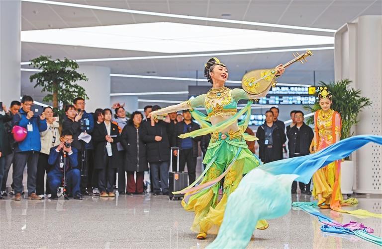 3月20日,在T3航站樓國內(nèi)到達層,文藝工作者為旅客表演經(jīng)典舞劇《絲路花雨》片段。