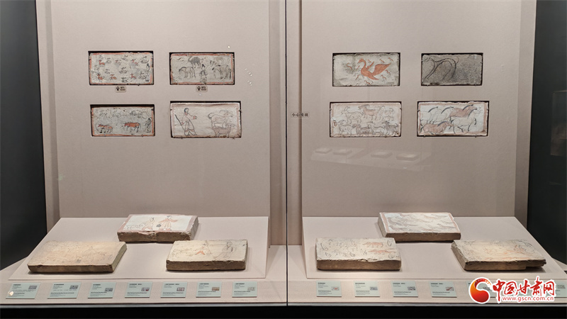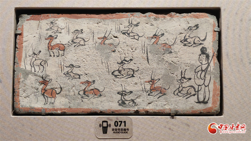在博物館的“古冢丹青——高臺魏晉十六國時期墓葬壁畫藝術陳列”展廳里,記者看到,《二牛耕地畫像磚》生動再現(xiàn)了當時的農(nóng)耕技術:兩頭耕牛架著直轅犁,后隨的男子一手扶犁一手揚鞭,展現(xiàn)了典型的“二牛抬杠”耕作方式?!赌谅箞D壁畫磚》則描繪了古人放牧鹿群的獨特場景,為研究當時的畜牧業(yè)發(fā)展提供了珍貴資料。