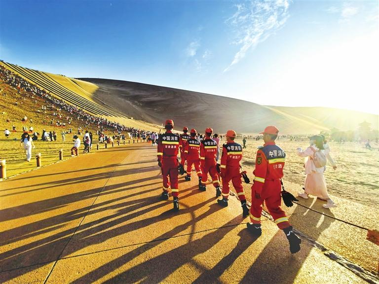 溫情關愛救助游客。鳴沙山“萬人大合唱”作為敦煌近年來的熱門文旅項目,暑期每日吸引數(shù)萬游客前來打卡,人群密集,安全隱患不容忽視。根據敦煌市委、市政府的安排,大隊每天派出消防車輛和指戰(zhàn)員現(xiàn)場執(zhí)勤,并根據實際需要在月牙泉和鳴沙山設置了兩處群眾服務救助執(zhí)勤點,由20人組成“九色鹿”女子消防服務隊,提供傷病緊急救助、失物尋找、人員疏散引導、安全知識宣傳教育等服務。僅今年,就幫助找回走失兒童21名、手機和錢包60余件,救助中暑等突發(fā)疾病游客7人。“九色鹿”女子消防服務隊的隊員們既懂外語,又了解敦煌文化,還熟悉消防安全知識,掌握一定的醫(yī)療救助和應急救援技能,她們的貼心服務受到了游客的好評,成為敦煌一道亮麗的風景線。