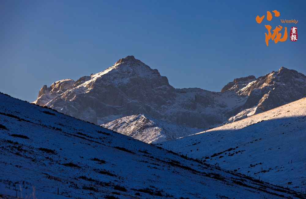 霞光沿著陡峭的山體徐徐蔓延,把寒光凜凜的積雪暈染成溫厚的琥珀色澤。天穹是沉靜的湛藍(lán),雪山則如一件精心鍛造的鎏金藝術(shù)品懸于其間——山腰以下浸入蒼茫暮色,峰巔之上仍燃燒著最后的輝煌。