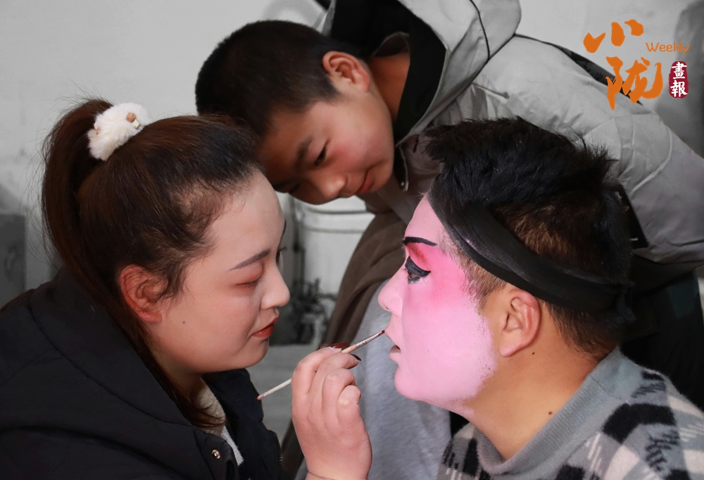 貼著紅春聯(lián)的屋門口,一位畫著戲曲臉譜的演員正對著手機調(diào)整妝容。這充滿鄉(xiāng)土氣息的戲曲準(zhǔn)備場景,滿是民間年俗里熱鬧又質(zhì)樸的煙火氣,也藏著傳統(tǒng)藝術(shù)在鄉(xiāng)土間的鮮活傳承。